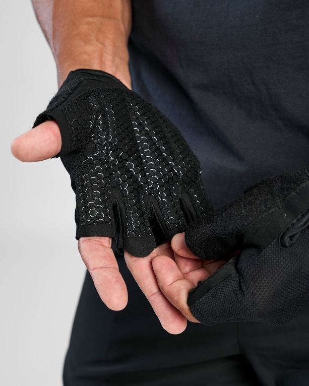 Indersiden er polstret og har et silikone-mønster for bedre greb og mindre risiko for, at hænderne glider – især vigtigt ved tunge løft. Handskerne har små stropper på langefingeren og ringfingeren, som gør det let at tage dem af.