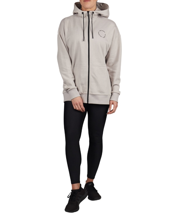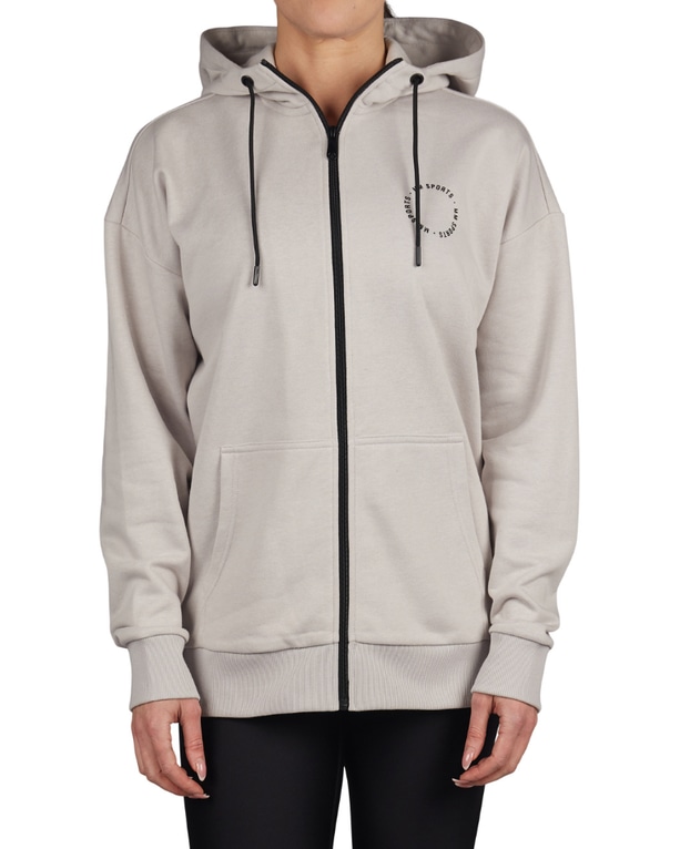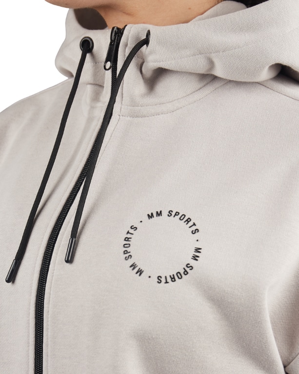 Hættetrøje til kvinder i en lang model med lynlås og en behagelig høj krave. Den er fremstillet af en tyndere bomuldsblanding, som gør den behagelig at have på. Foret hætte med snøre og lomme foran. Flotte detaljer og MM Sports-logo foran på brystet.